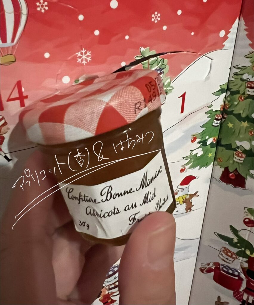 ▼12/1はアプリコットとはちみつ。甘いマーマレードな感じ。クレープにつけて食べたら美味しそう。